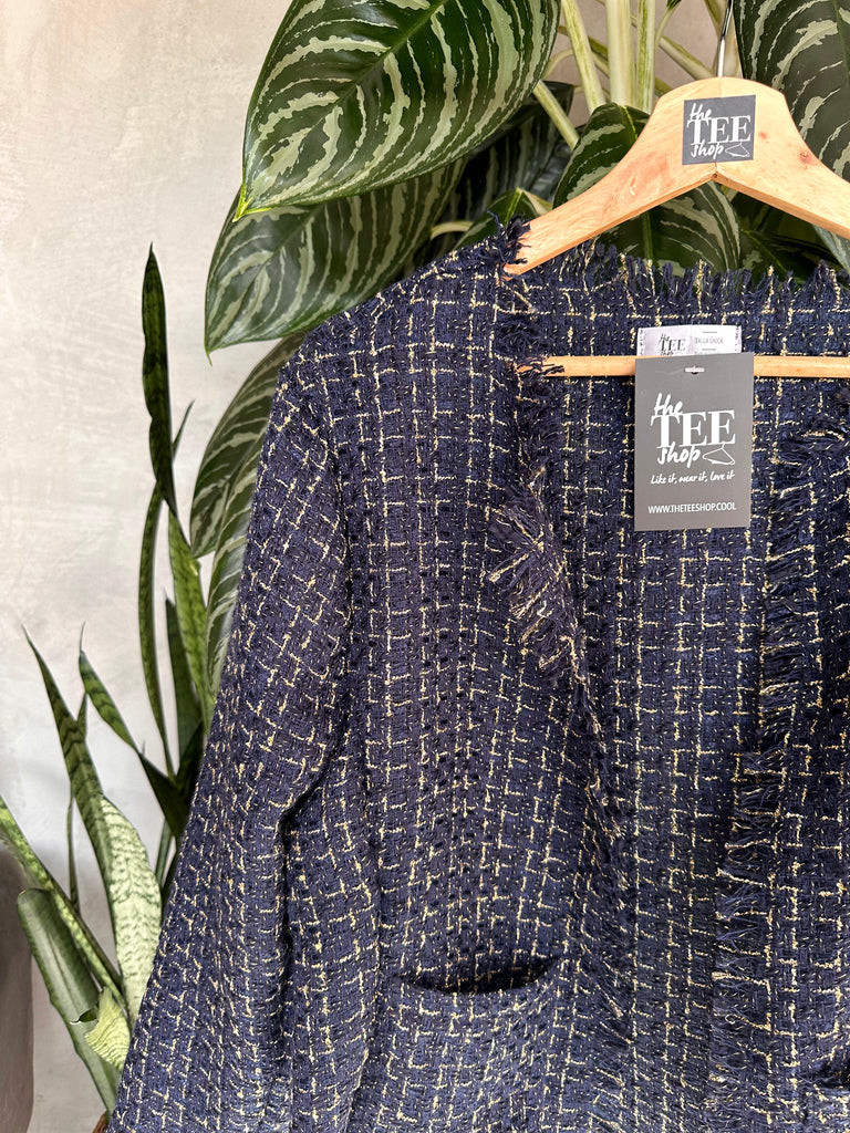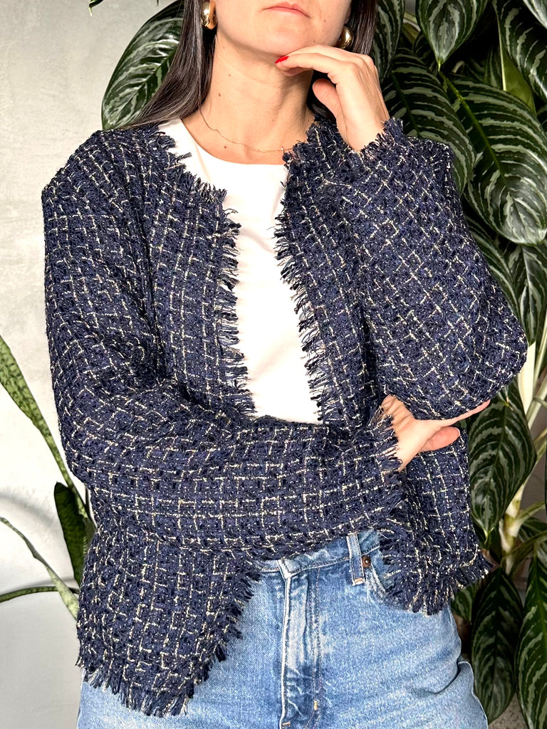 Chaqueta en tejido azul con hilos dorados, con desflecados y dos bolsillos frontales sobrepuestos.